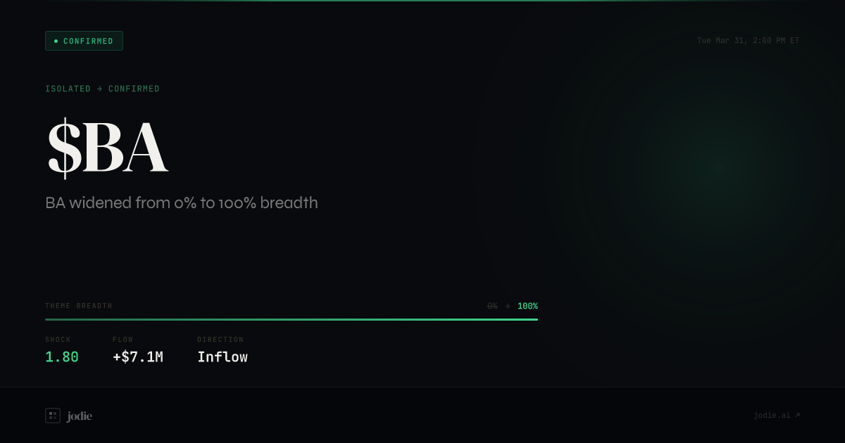 $BA widened from 0% to 100% breadth at Tue, Mar 31 at 2:00 PM ET. Shock 1.80. Story: