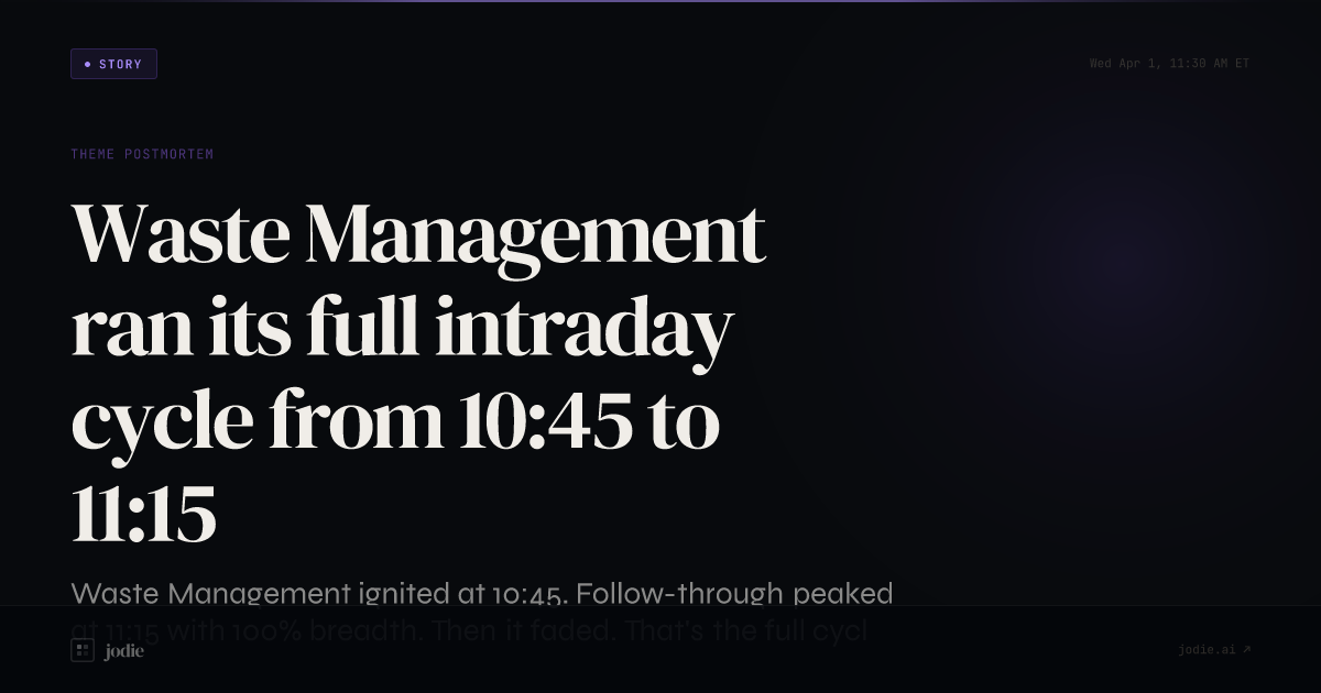 Waste Management ignited at 10:45. Follow-through peaked at 11:15 with 100% breadth. Then it faded. That's the full cycle.