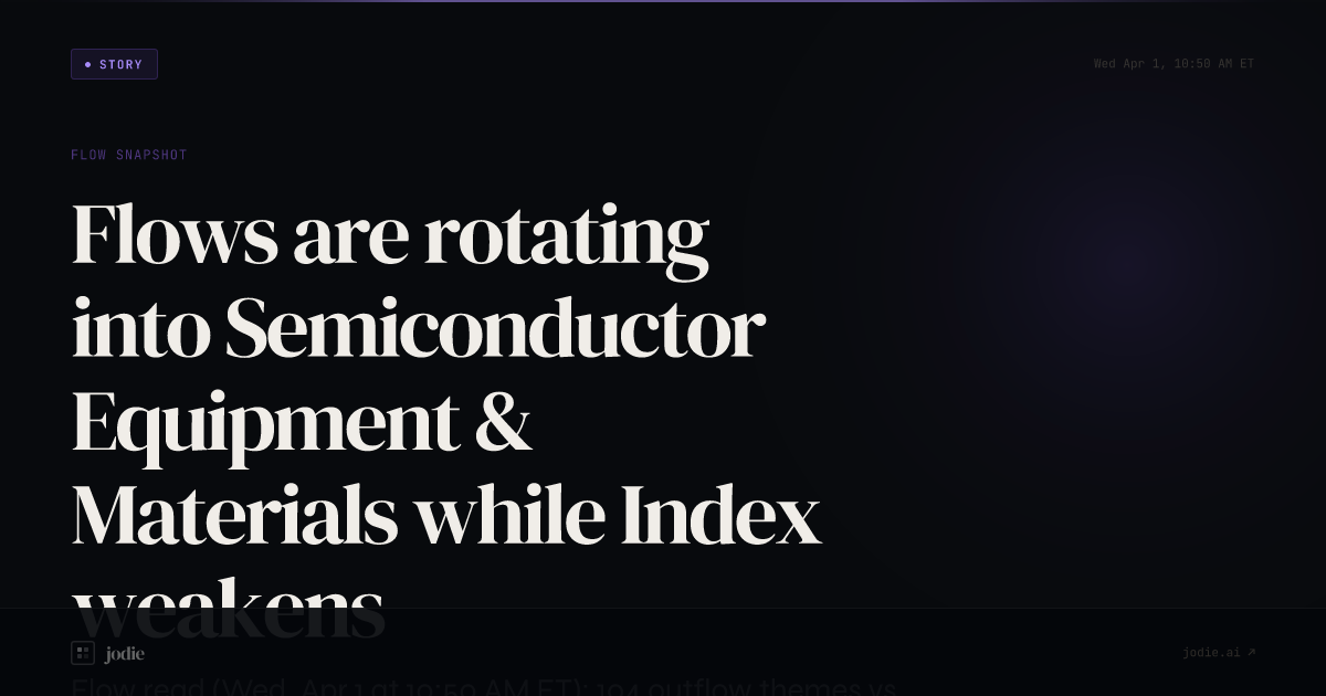 Flow read (Wed, Apr 1 at 10:50 AM ET): 104 outflow themes vs 131 inflow themes. Largest exit Index: −$30M. Top bid Semiconductor Equipment & Materials: +$113M.