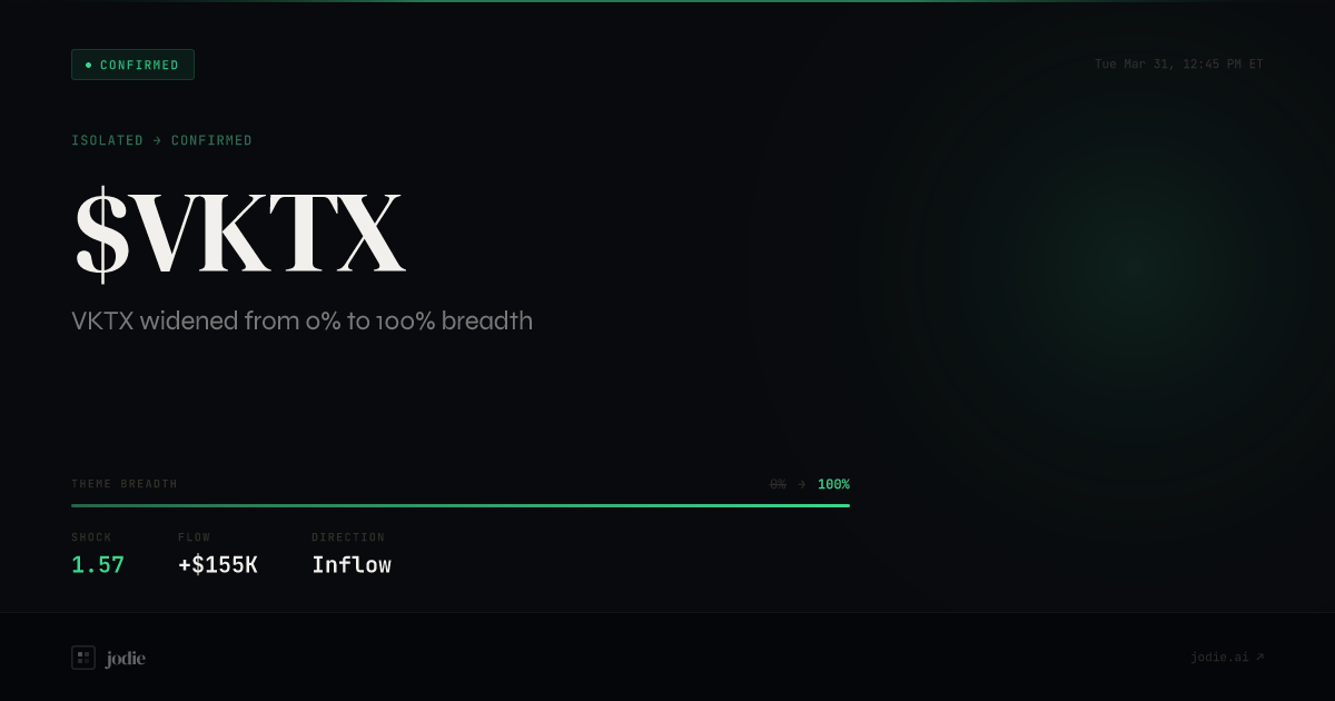$VKTX widened from 0% to 100% breadth at Tue, Mar 31 at 12:45 PM ET. Shock 1.57. Story: