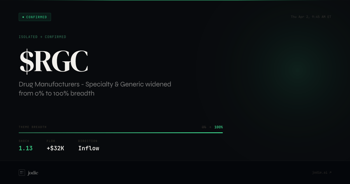 Drug manufacturers - specialty & generic widened from 0% to 100% after $RGC moved first.