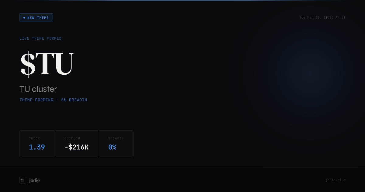$TU has formed as a new live theme at Tue, Mar 31 at 11:00 AM ET. Shock 1.39, breadth 0%. Outflow −$215.8K. Story: