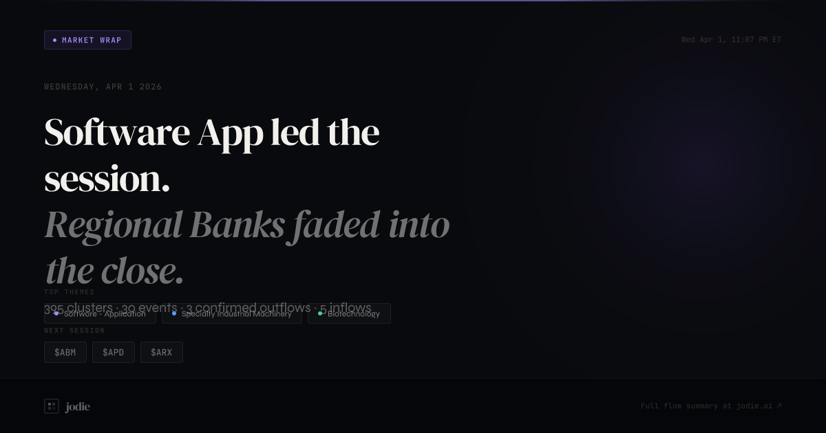 EOD structure posted (2026-04-01): rotation confirmed with Software - Application flow shift near 10:45 ET.