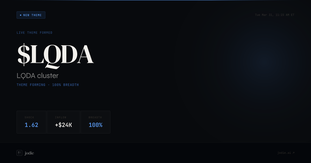 $LQDA has formed as a new live theme at Tue, Mar 31 at 11:15 AM ET. Shock 1.62, breadth 100%. Inflow +$24.0K. Story: