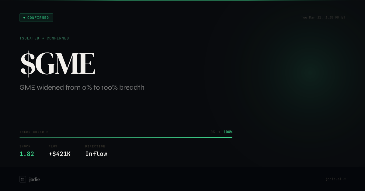 $GME widened from 0% to 100% breadth at Tue, Mar 31 at 3:30 PM ET. Shock 1.82. Story: